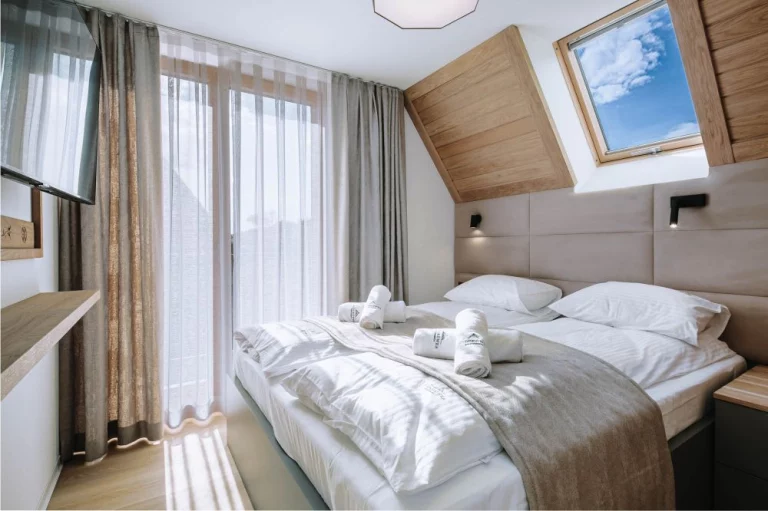 Sypialnia: łóżko małżeńskie, telewizor, szafa, stoliki nocne, wyjście na balkon z widokiem bocznym na Tatry oraz łąkę