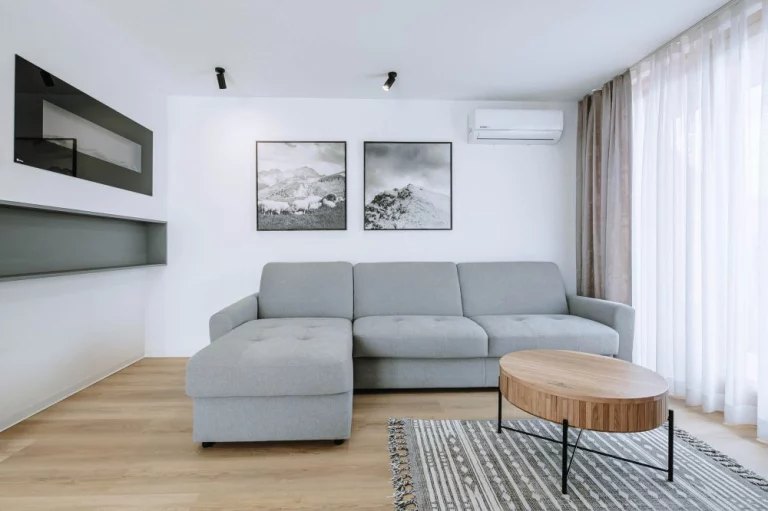 Salon: 2 osobowy rozkładany narożnik, stolik kawowy, telewizor samsung, klimatyzacja, kominek elektryczny, wyjście na balkon z widokiem na Panoramę Tatr oraz Zakopane i Kościelisko