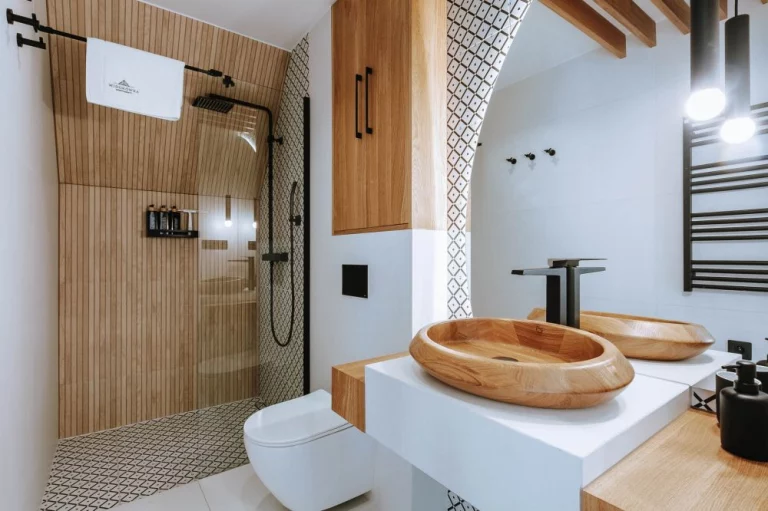 Łazienka: kabina prysznicowa, toaleta, umywalka, szafka, lustro suszarka do włosów