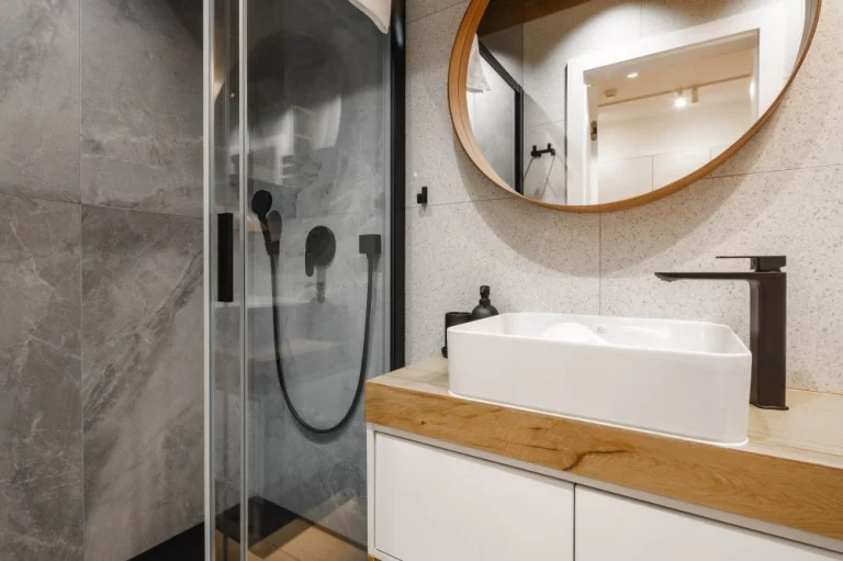 Łazienka: kabina prysznicowa, umywalka, toaleta, lustro, pralka, suszarka do włosów