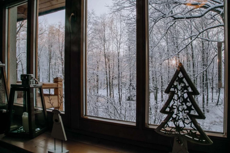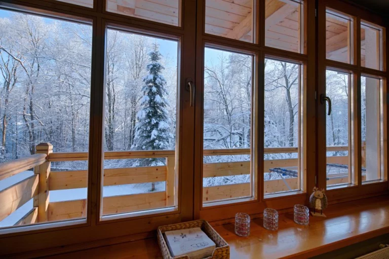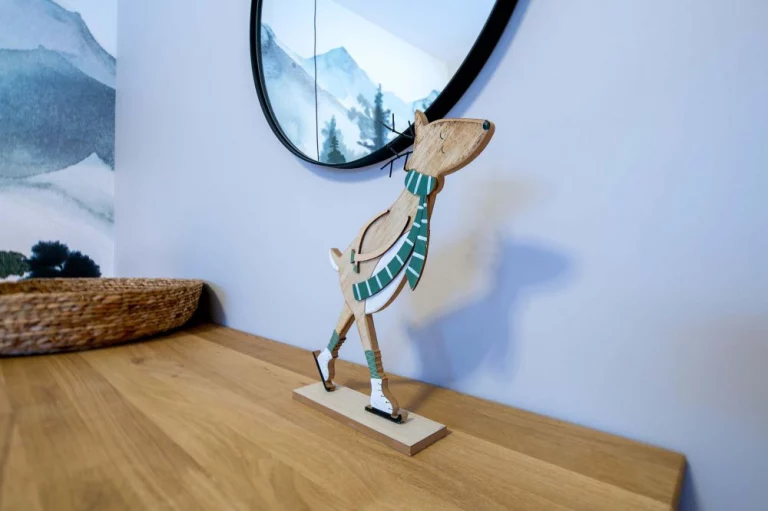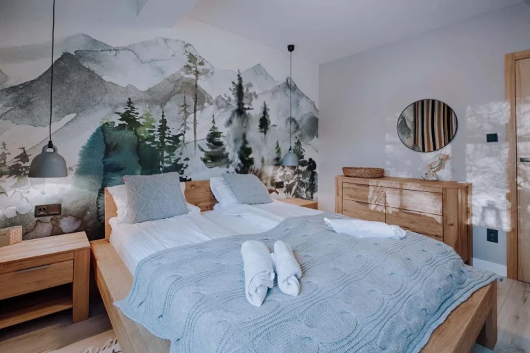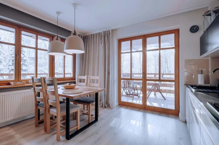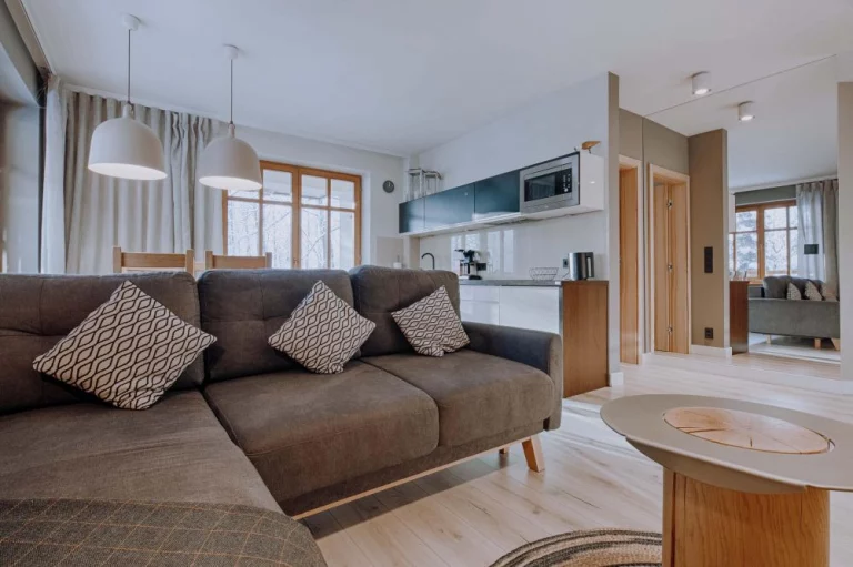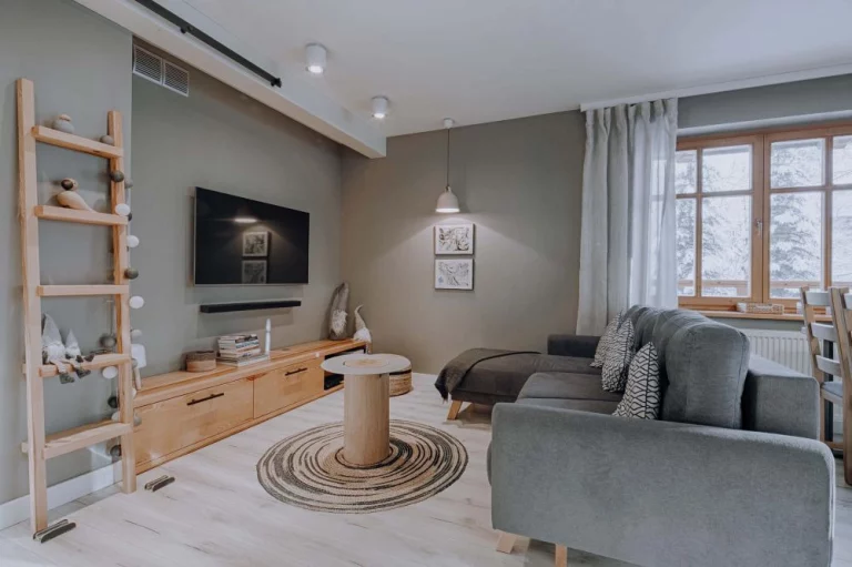 Salon z wyjściem na duży taras z meblami ogrodowymi, z którego rozpościera się widok na Tatry i las Doliny Cichej Wody z potokiem górskim przepływającym w pobliżu. Z tarasu widać także piękny i stylowy budynek Muzeum Stylu Zakopiańskiego.