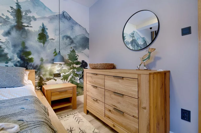 Sypialnia: łóżko małżeńskie, komoda, radio, wyjście na taras