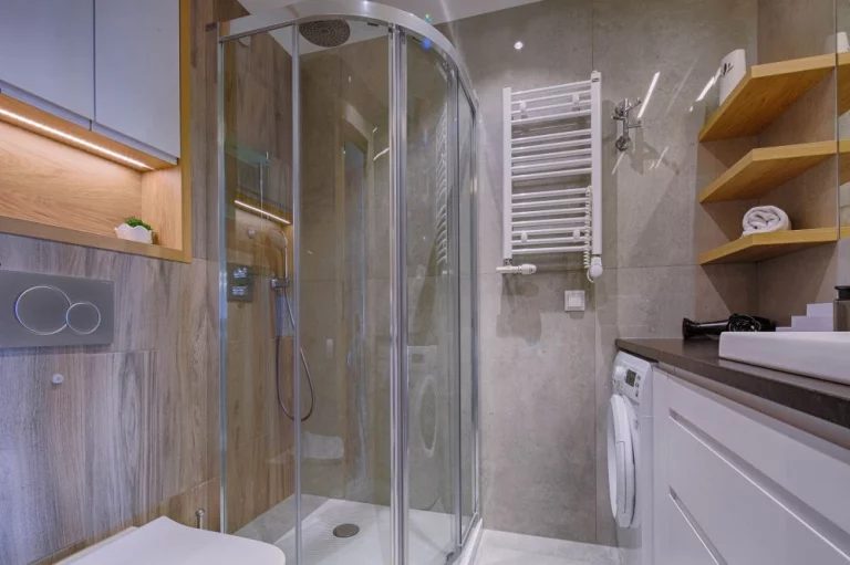 Łazienka: pralka, kabina prysznicowa z deszczownicą, wc, umywalka z szafką, suszarka do włosów