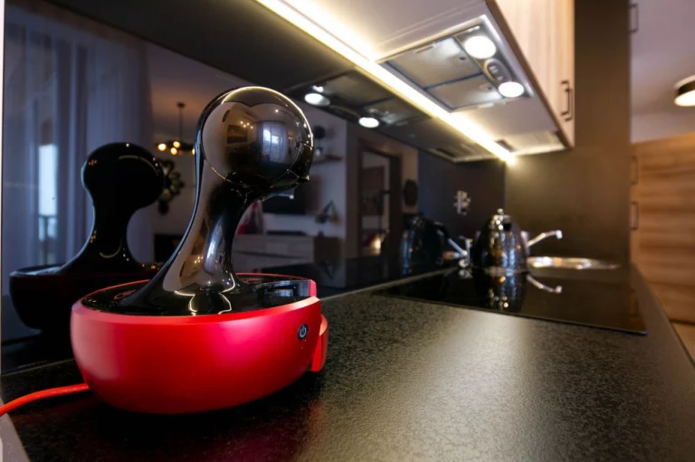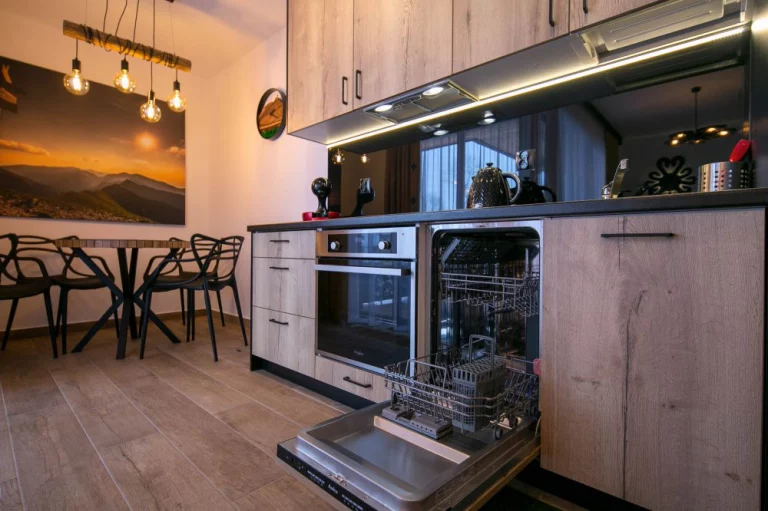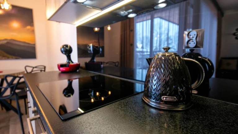 Aneks kuchenny: stół okrągły z 4 krzesłami, piekarnik, czajnik elektryczny, ekspres do kawy Nescafe Dolce Gusto, czteropalnikowa płyta indykcyjna, duża lodówka, jednokomorowy zlew, zmywarka, toster, mikrofalówka, zastawa szklana, kieliszki, garnki, patelnia, sztućce, akcesoria do gotowania
