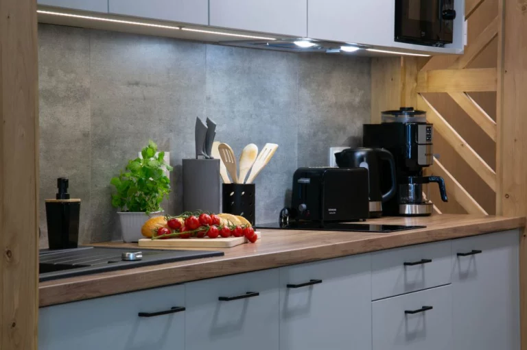 Aneks kuchenny: lodówka, 2 palnikowa płyta ceramiczna, czajnik elektryczny, ekspres do kawy, zmywarka, toster, kuchenka mikrofalowa, naczynia, sztućce, garnki, zastawa szklana