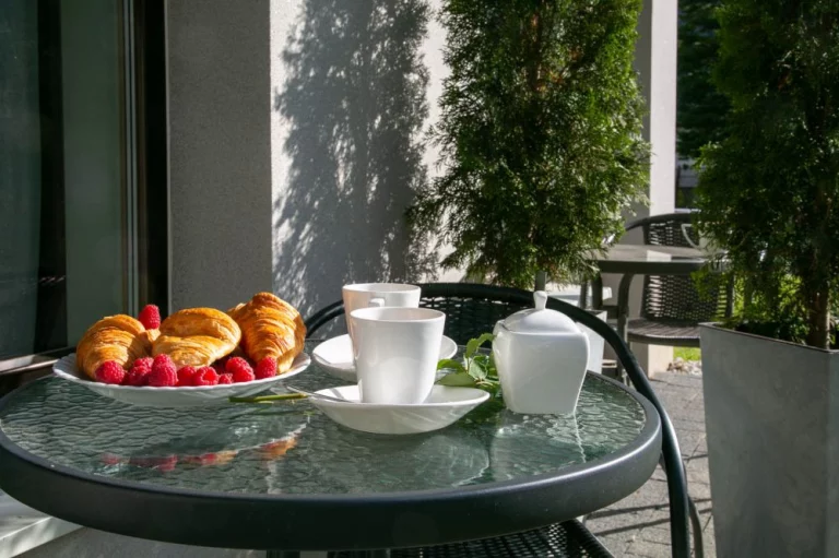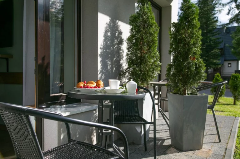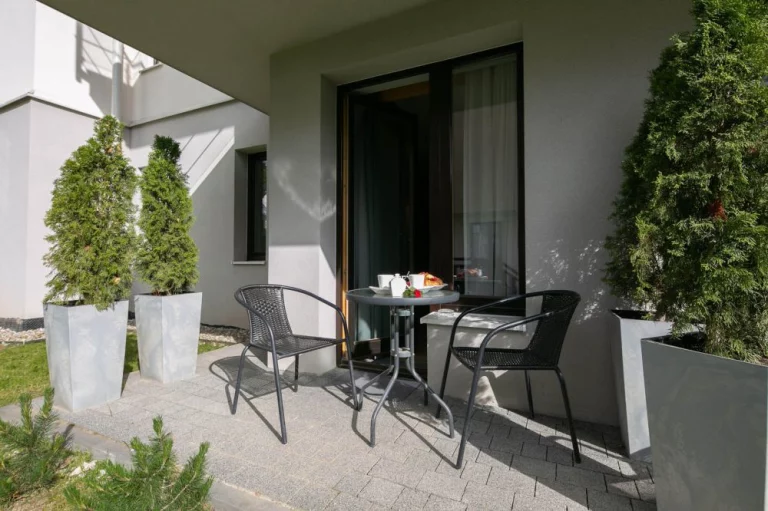 Apartament znajduje się na parterze budynku i posiada swój własny taras z meblami wypoczynkowymi. Do apartamentu przynależy dedykowane, zamykane szlabanem zewnętrzne miejsce parkingowe bezpośrednio przed budynkiem apartamentowca.