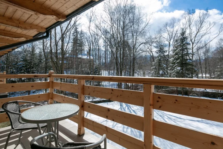 Salon z wyjściem na balkon na którym znajdują się meble wypoczynkowe. Widok na las Doliny Cichej Wody z potokiem górskim przepływającym w pobliżu. Z tarasu widać także budynek Muzeum Stylu Zakopiańskiego.