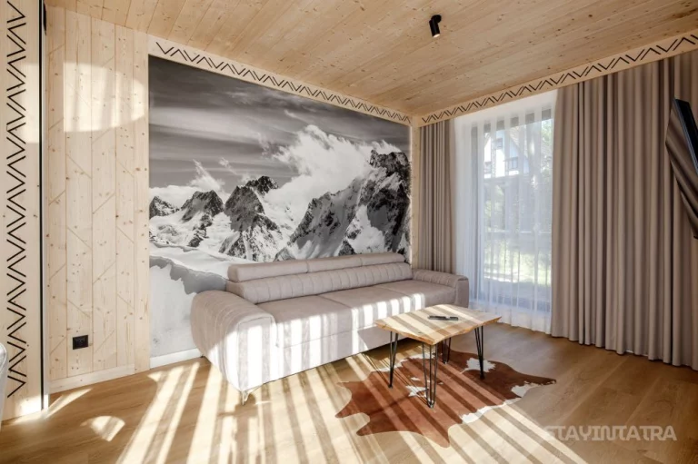 Salon: rozkładana sofa, stolik kawowy, telewizor, szafa, klimatyzacja