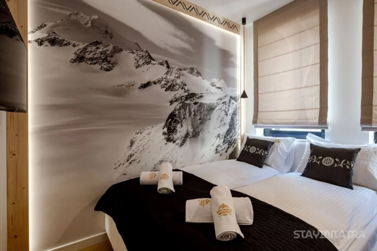 Sypialnia: łóżko małżeńskie, szafka nocna, telewizor, szafa, klimatyzacja