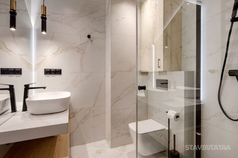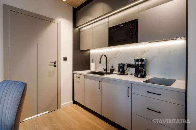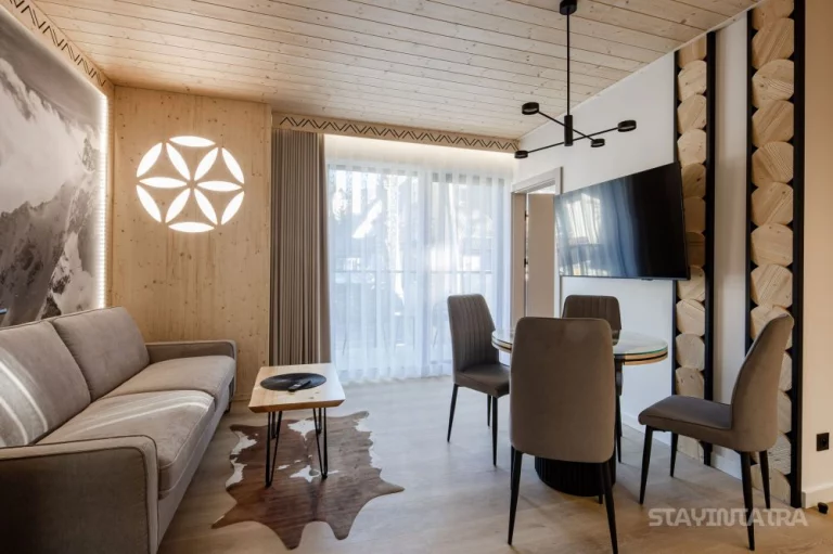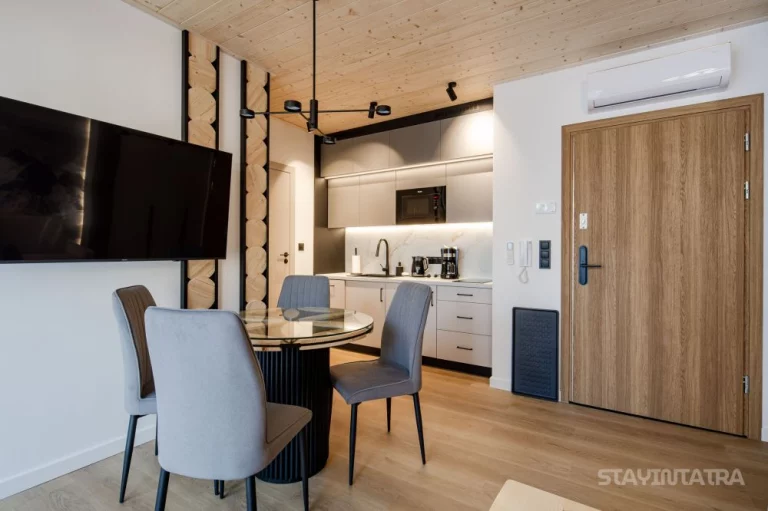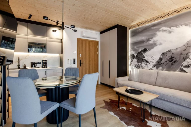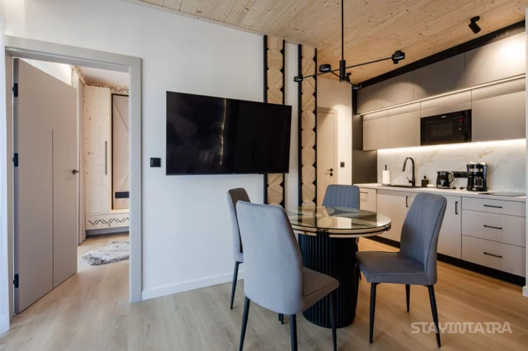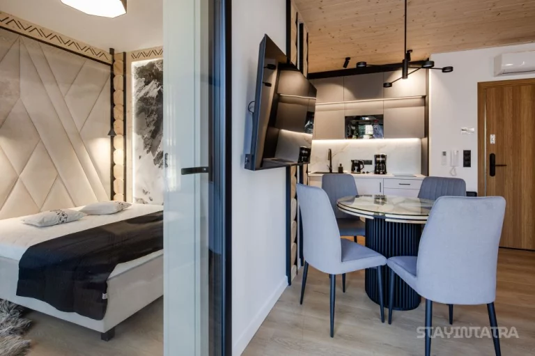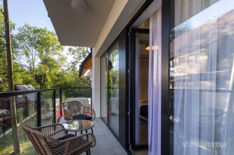 Struktura Apartamentu: salon z aneksem kuchennym z wyjściem na balkon z meblami ogrodowymi: stolik i dwa krzesła widok na Tatry fragment pomiędzy domami, zamykana sypialnia z wyjściem na balkon, łazienka