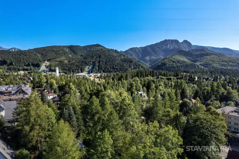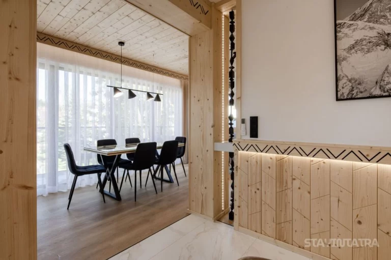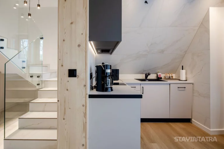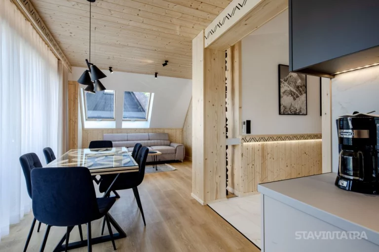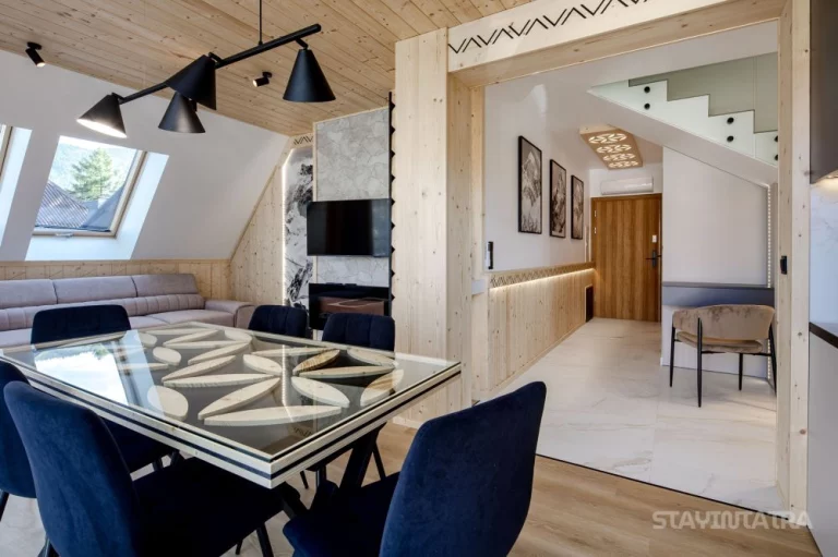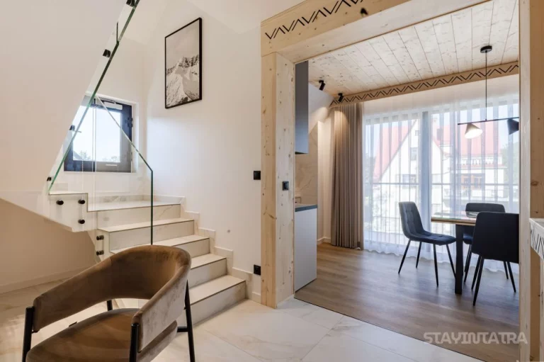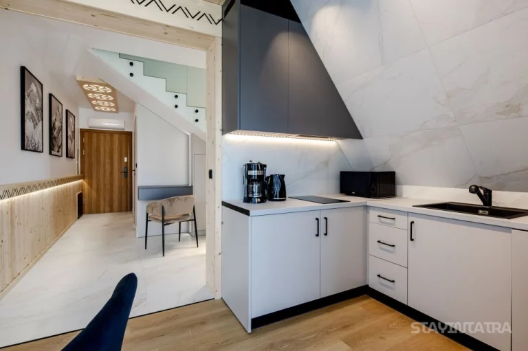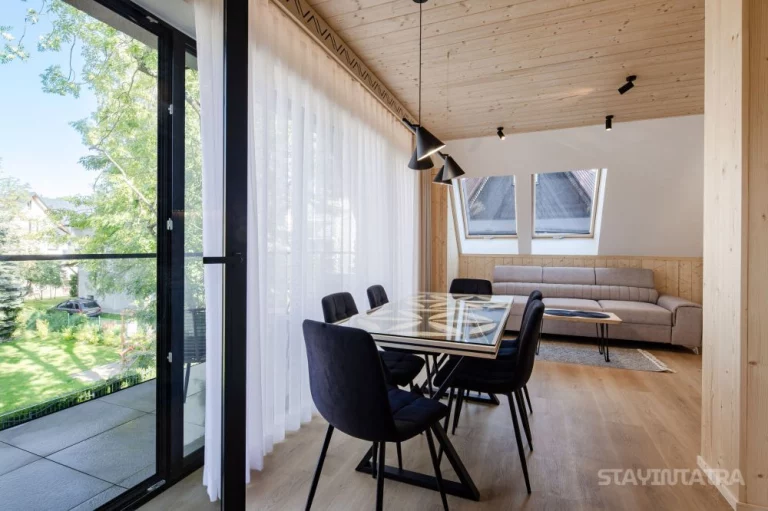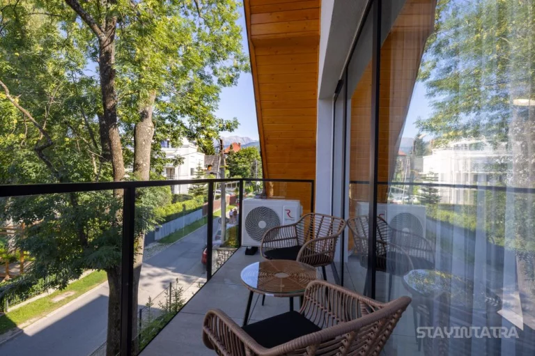 Struktura Apartamentu DWUPOZIOMOWEGO: salon w oknie dachowym widok pomiędzy budynkami na część nosala i fragment Tatr z aneksem kuchennym z wyjściem na balkon z meblami ogrodowymi: stolik i dwa krzesła schody, dwie zamykane sypialnie, łazienka i przedpokój