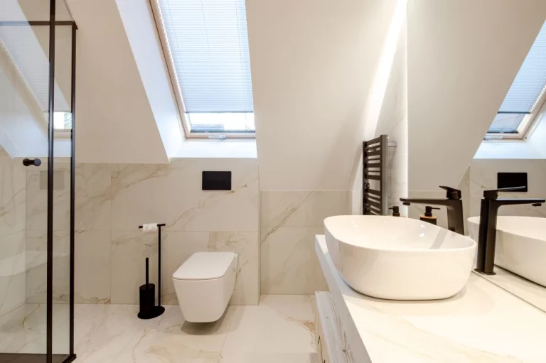 Łazienka: kabina prysznicowa, toaleta, umywalka, lustro, szuflada, szafka, suszarka do włosów