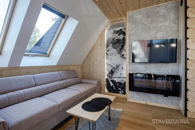 Sypialnia 1: łóżko małżeńskie, telewizor, klimatyzator, widok na Tatry z obu okien dachowych