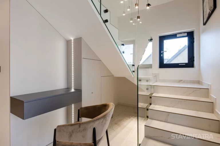 Przedpokój: wieszak na ubrania, biurko z fotelem, szafa, schody