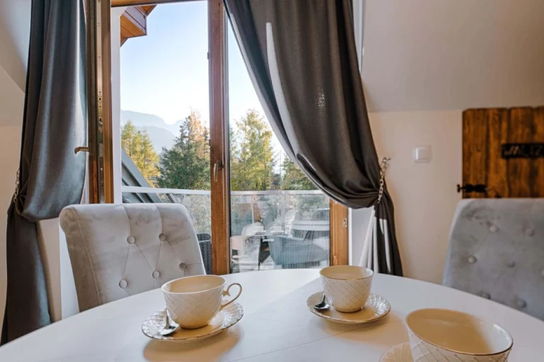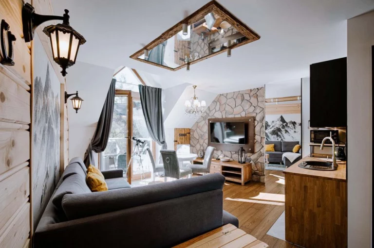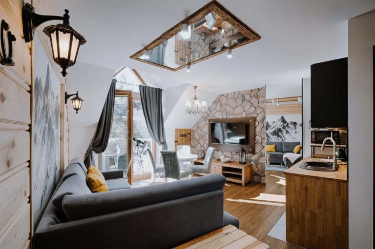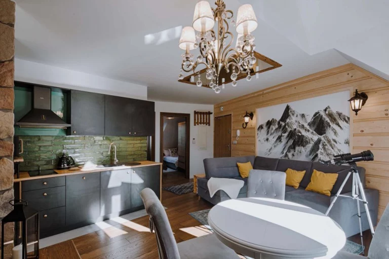 Komfortowy apartament dla 6 osób z przepięknym widokiem na Giewont! Zlokalizowany nieopodal wlotu Doliny Strążyskiej w wyjątkowo atrakcyjnej części Zakopanego. Aranżacja apartamentu to połączenie nowoczesnego desingu z elementami eleganckiego stylu glamour, wzbogacone elementami górskimi. Z okien sypialni można podziwiać widok na Gubałówkę, a z salonu słynny Giewont. W apartamencie do tego celu zainstalowana została specjalna luneta, dzięki której o każdej porze dnia można obserwować turystów zdobywających ten słynny szczyt! W apartamencie zainstalowane jest łącze światłowodowe (bezpłatne WiFi) i Netflix. Kąpiel w łazience umilają dźwięki muzyki, z zainstalowanego tu systemu audio!