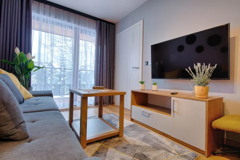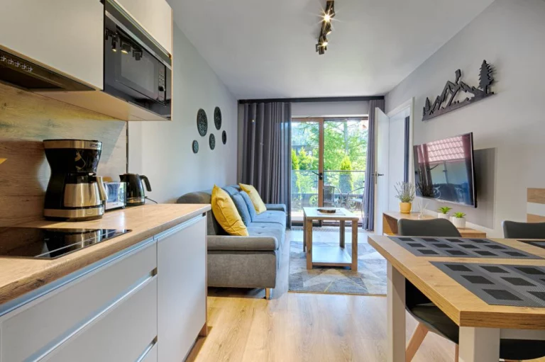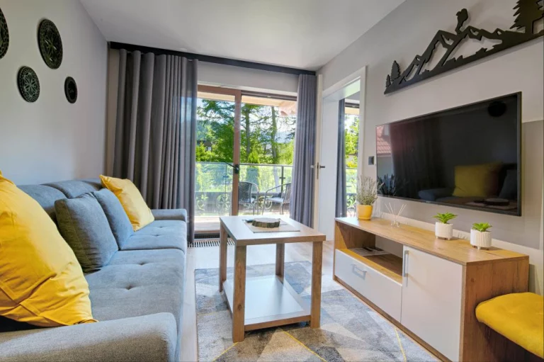 Salon: dwuosobowa rozkładana sofa, telewizor Sony, szafka RTV, stolik kawowy, wyjście na duży balkon z widokiem na Nosal