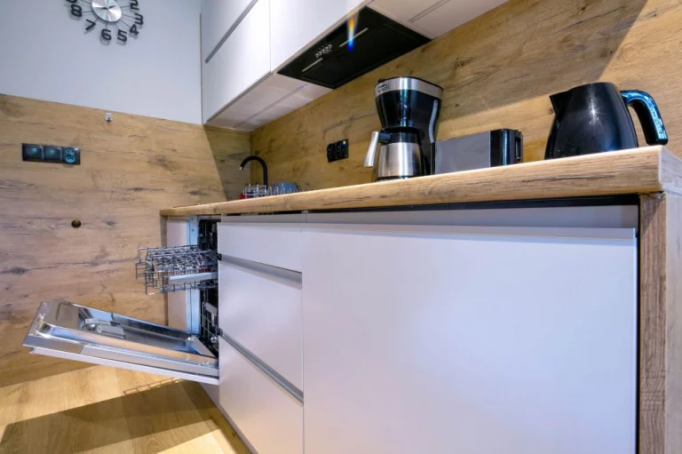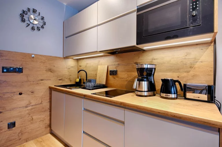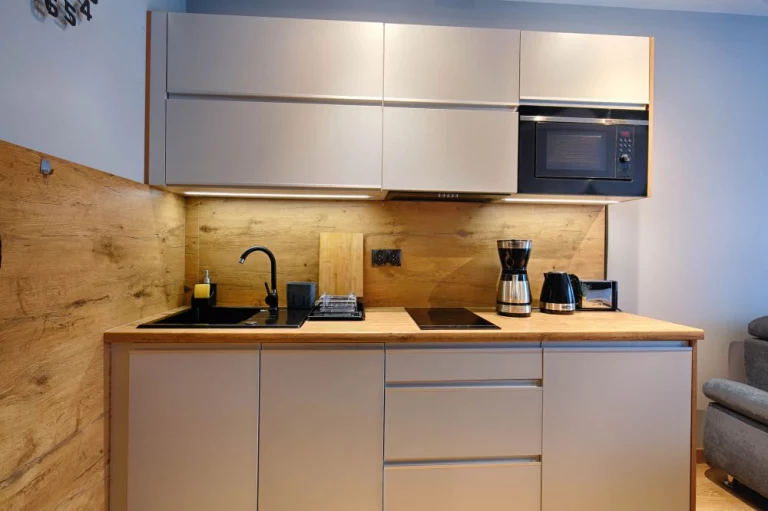 Aneks kuchenny: stół z 4 krzesłami, dwupalnikowa płyta indukcyjna, ekspres do kawy, czajnik elektryczny, toster, mikrofalówka, lodówka, zmywarka, zlew jednokomorowy, zastawa szklana, kieliszki, garnki, patelnia, szczućce, akcesoria do gotowania