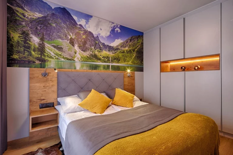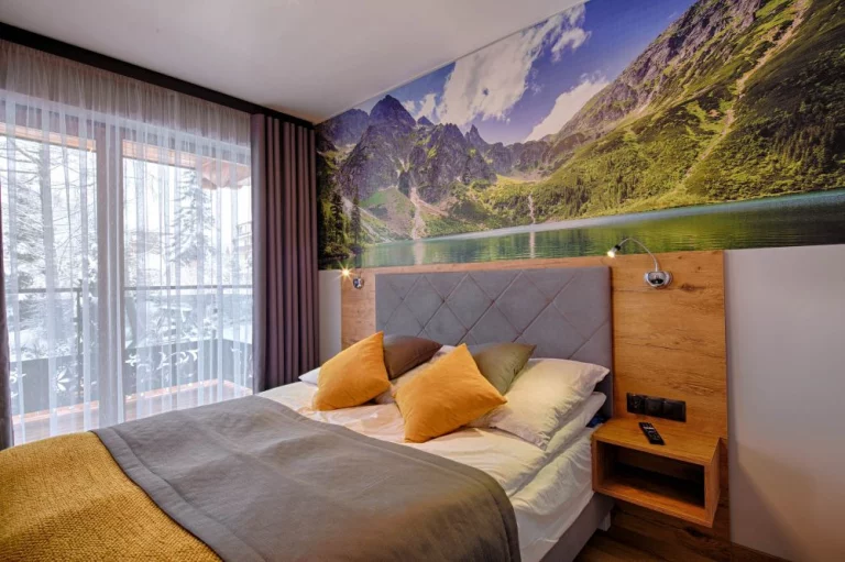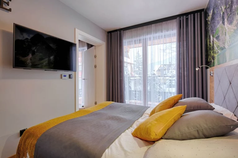 Sypialnia: łóżko małżeńskie, dwie szafki nocne, dwie lampki nocne, gniazdka po obu stronach łóżka, telewizor, czterodrzwiowa szafa, deska do prasowania z żelazkiem, odkurzacz, wyjście na balkon z widokiem na Nosal