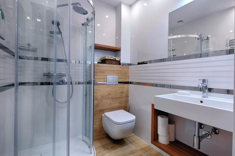 Łazienka: kabina prysznicowa z deszczownicą, toaleta, umywalka z otwartą półką, lustro, suszarka do włosów