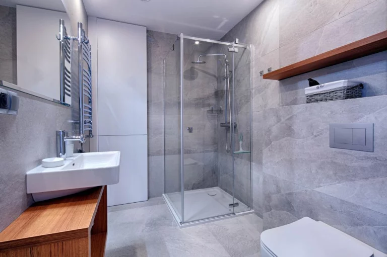 Łazienka: pralka, kabina prysznicowa z deszczownicą, umywalka z otwartą półką, lustro, toaleta, szafka dwudrzwiowa, suszarka do włosów