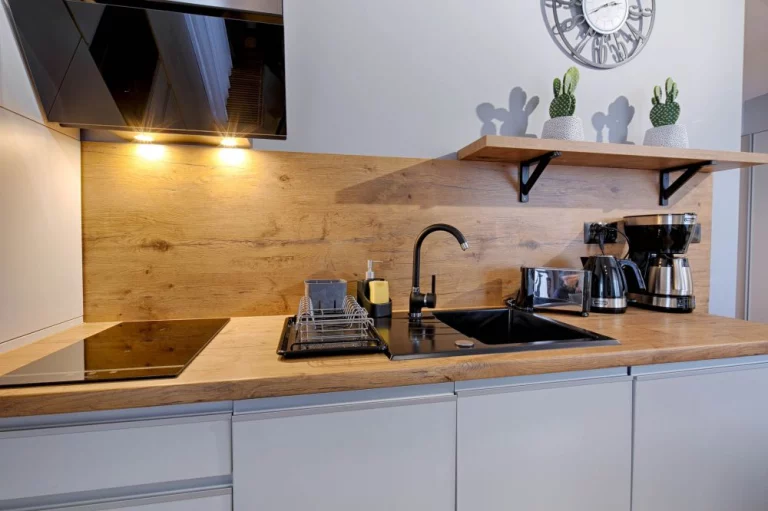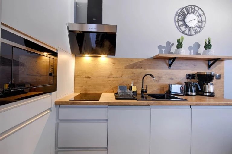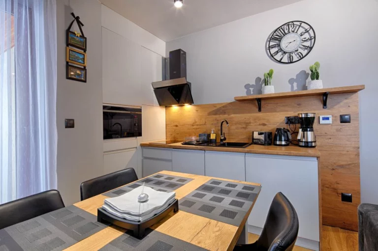 Aneks kuchenny: ekspres do kawy, czajnik elektryczny, toster, dwupalnikowa płyta indukcyjna, zmywarka, zlew jednokomorowy, mikrofalówka, lodówka, zastawa szklana, kieliszki, garnki, patelnia, sztućce, akcesoria do gotowania