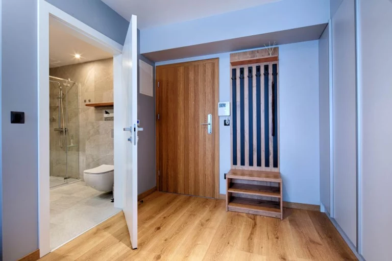 Przedpokoju: wieszak, szafka na buty, szafa trzydrzwiowa, żelazko i deska do prasowania, odkurzacz, łyżka do butów