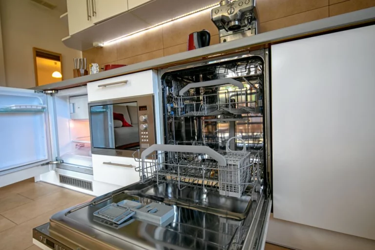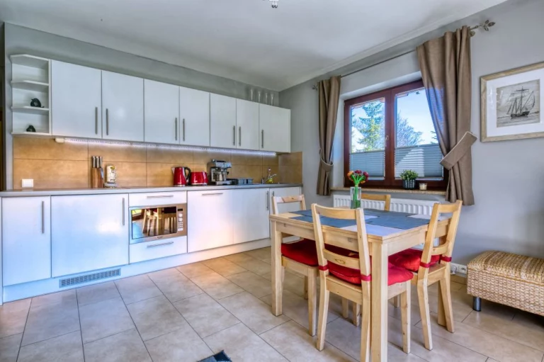 Aneks kuchenny: lodówka, zmywarka, pralka, płyta ceramiczna, kuchenka mikrofalowa, toster, naczynia, sztućce, garnki, zlew, kieliszki do wina i szampana