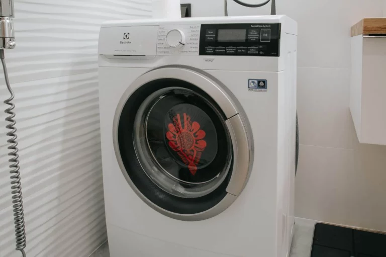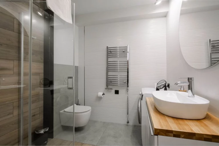 Łazienka: pralka, kabina prysznicowa z deszczownicą, umywalka z szafką, duże okrągłe lustro, toaleta, suszarka hotelowa, waga łazienkowa