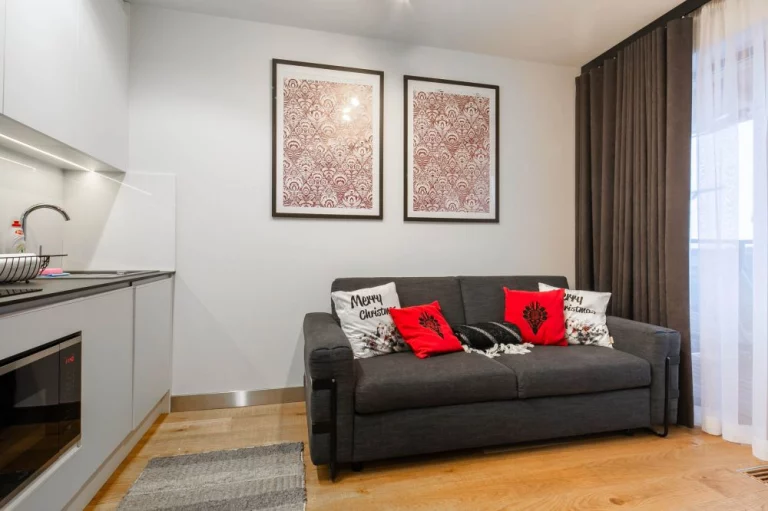 Salon: dwuosobowa rozkładana sofa, stolik kawowy, duża komoda RTV, duży telewizor Sony, zaciemniające zasłony, wyjście na duży balon