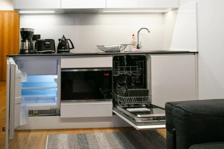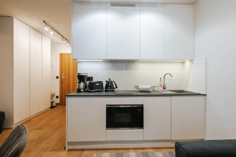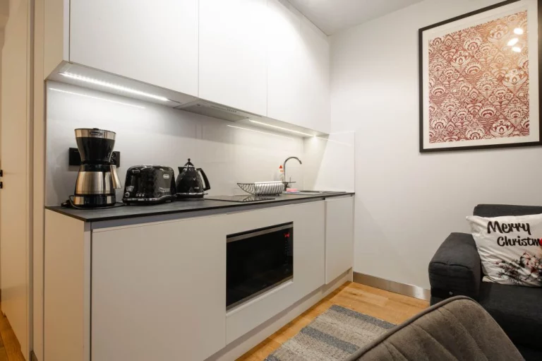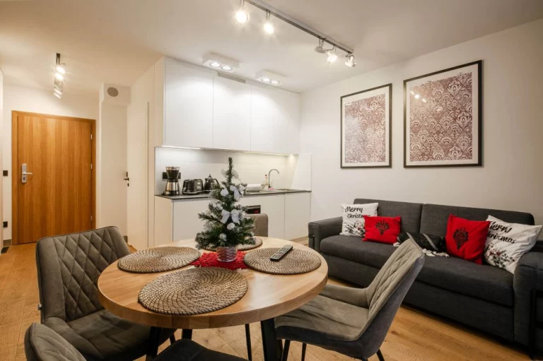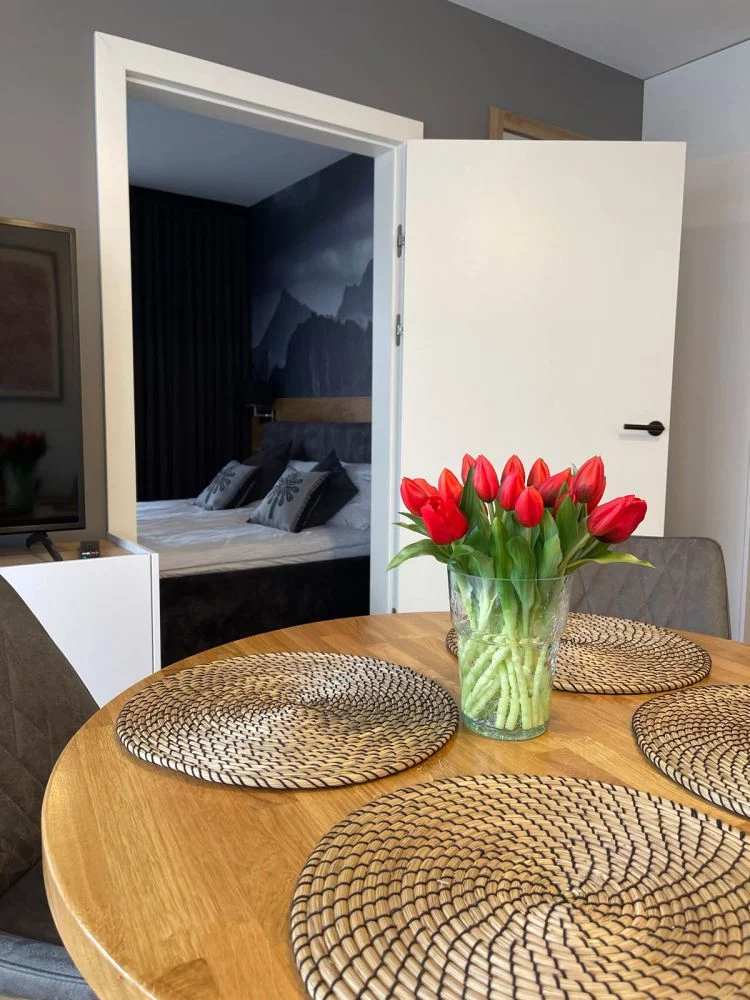 Aneksy kuchenny: okrągły stół z 4 krzesłami, zmywarka, mikrofalówka, ekspres do kawy, toster, czajnik elektryczny, dwupalnikowa płyta indykcyjna, lodówka, zlew jednokomorowy, dzbanek filtrujący Dafi, zastawa szklana, kieliszki, garnki, patelnia, akcesoria do gotowania