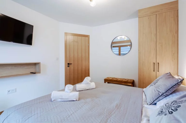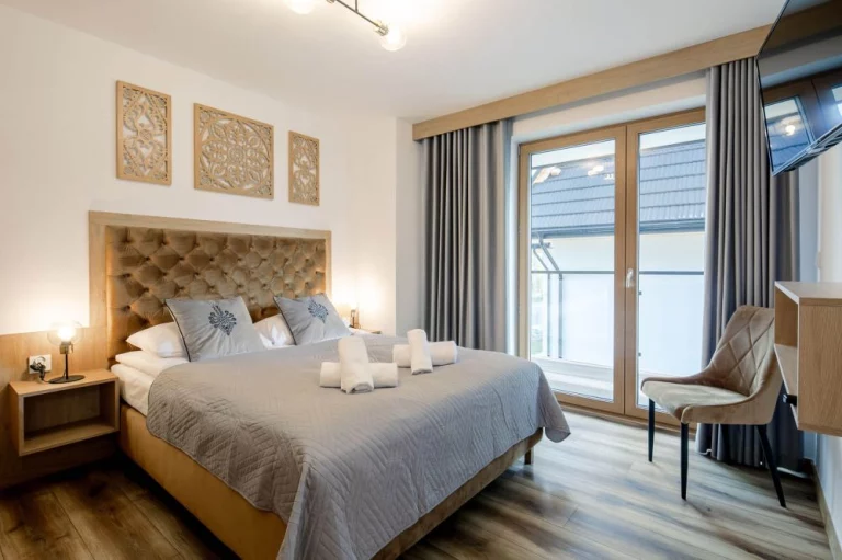 Sypialnia: łóżko małżeńskie, balkon z widokiem na Tatry, 2 szafki nocne z lampkami, szafa, pufa, przy łóżku znajdują się gniazda elektryczne