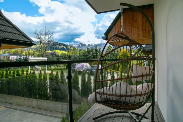 Salon: 2 osobowa rozkładana sofa, stolik kawowy, stół, 3 krzesła, TV'45, wyjście na balkon z pięknym widokiem na panoramę Tatr z meblami ogrodowymi, szafa, klimatyzacja.