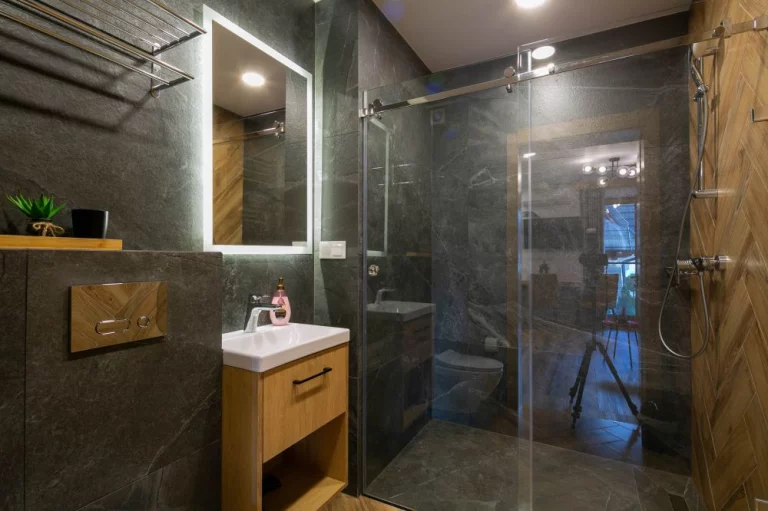 Łazienka - prysznic, umywalka, toaleta, lustro, grzejnik ręcznikowy, suszarka do włosów