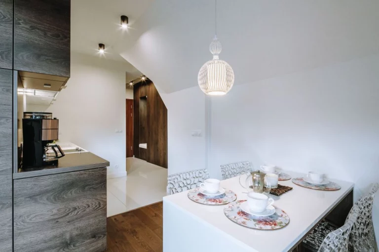Aneks kuchenny: płyta ceramiczna, zmywarka, mikrofalówka z funkcją piekarnika, zlew, lodówka, ekspres przelewowy z młynkiem do kawy, toster, naczynia, garnki, kieliszki
