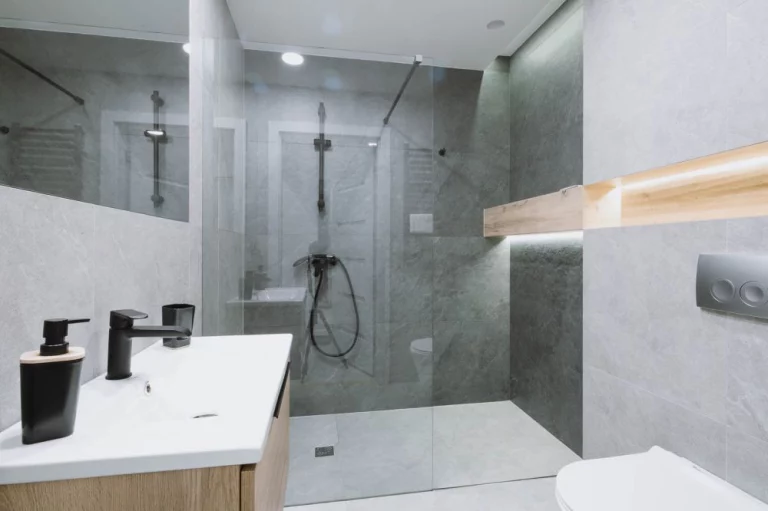 Łazienka: kabina prysznicowa, umywalka z szafką, lustro, toaleta