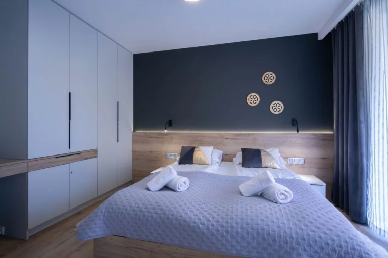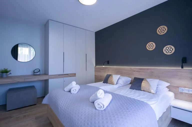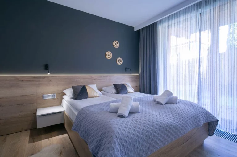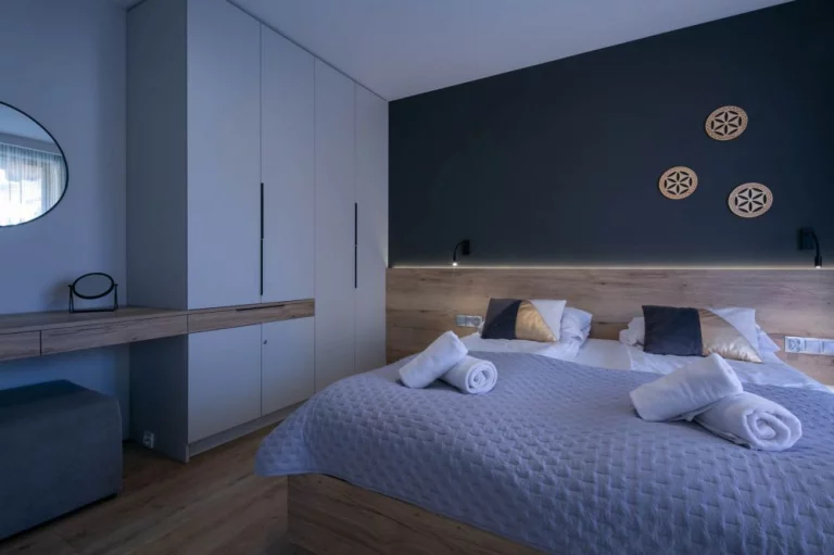 Sypialnia: łóżko małżeńskie, dwa stoliki nocne dwie lampki nocne wraz z lampkami do czytania, kontakty po obu stronach łóżka, szafa, lustro, wyjście na taras.