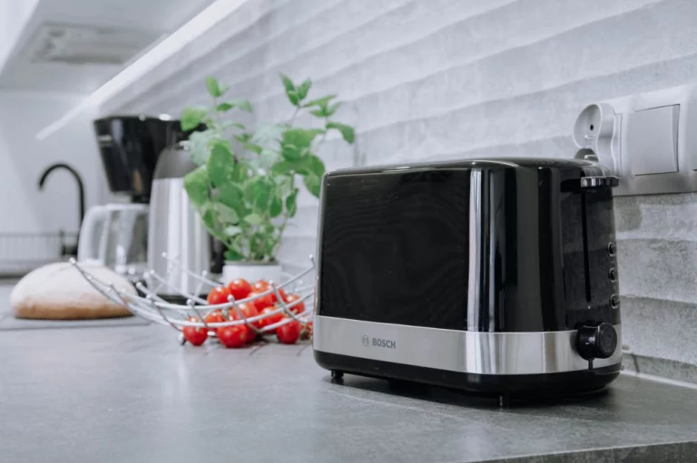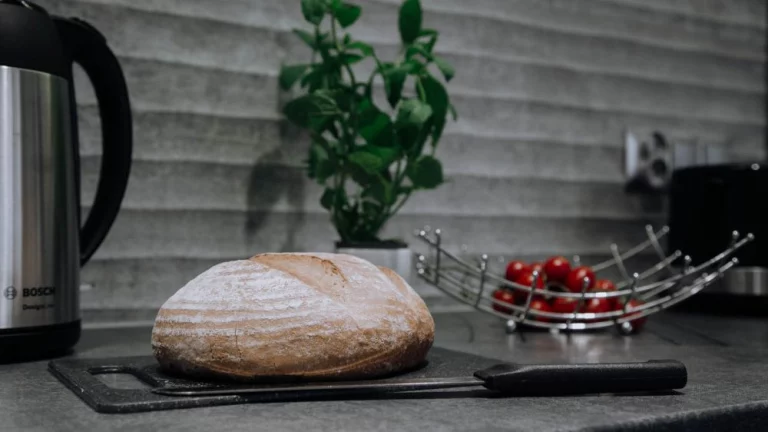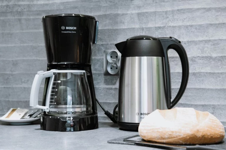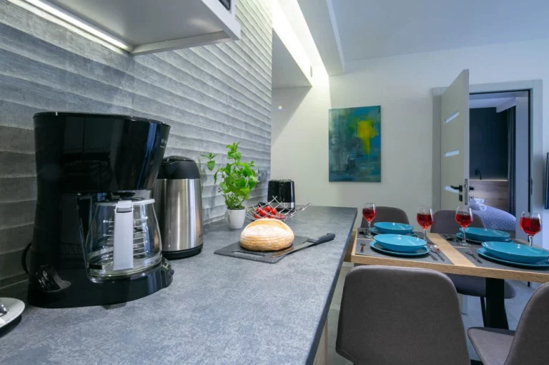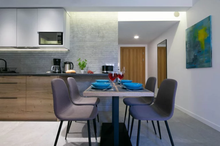 lada kuchenna, 3 krzesła, kuchenka mikrofalowa, czajnik elektryczny marki Bosch, ekspres do kawy przelewowy Bosch, lodówka, toster Bosch, opiekacz do kanapek, płyta indukcyjna, zlew jednokomorowy, naczynia, garnki, sztućce, zastawa szklana