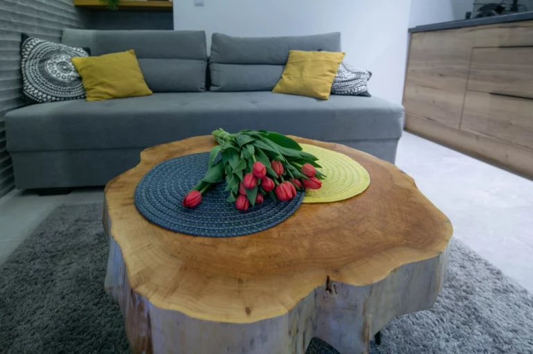Salon: dwuosobowa rozkładana sofa, stolik kawowy, 2 pufy, wyjście na taras, TV 42'