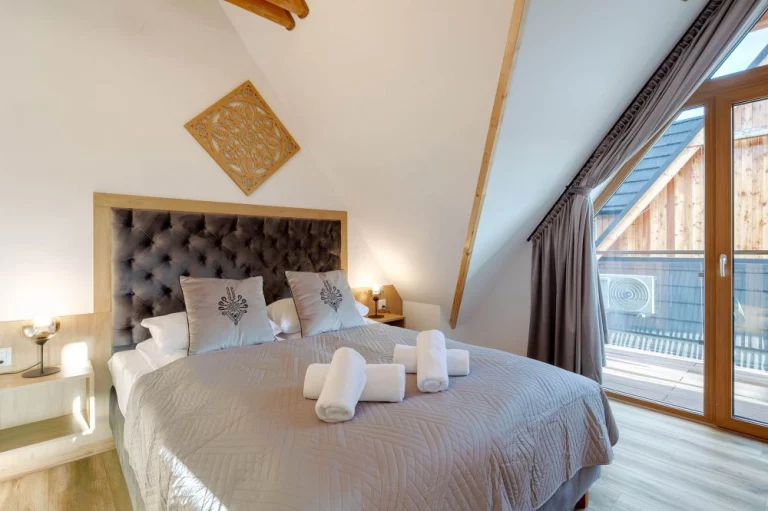 Sypialnia: łóżko małżeńskie, balkon z widokiem na Tatry, 2 szafki nocne z lampkami, szafa, pufa, przy łóżku znajdują się gniazda elektryczne