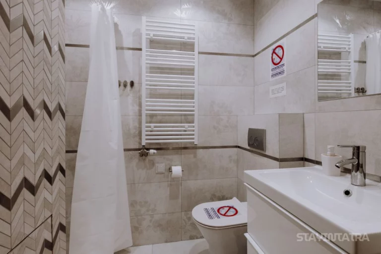 Łazienka: prysznic, umywalka, toaleta, grzejnik ręcznikowy, lustro, suszarka do włosów