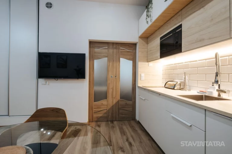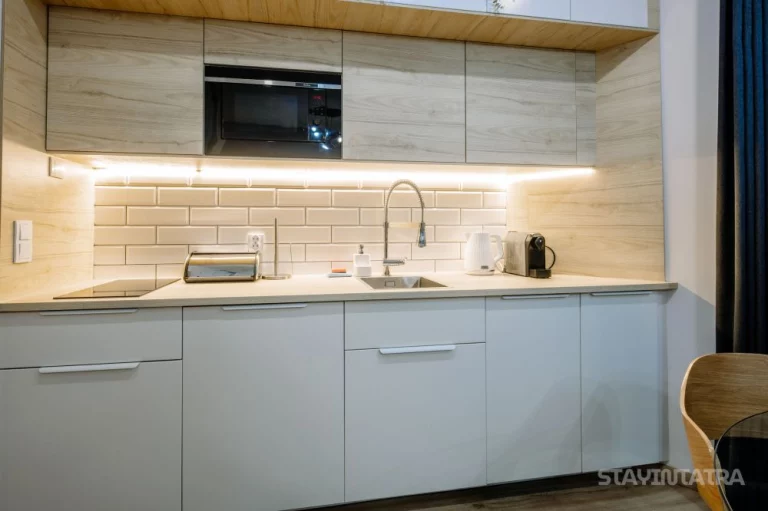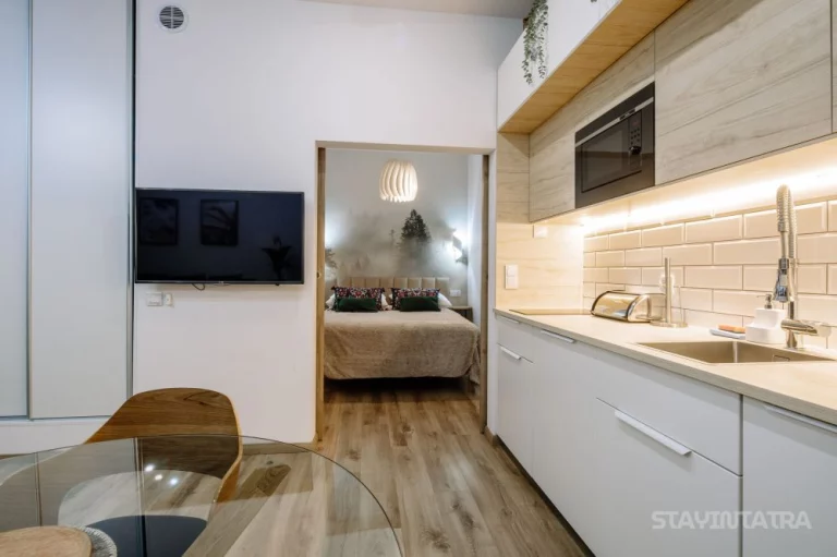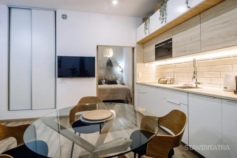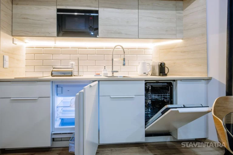 Aneks kuchenny: 2 palnikowa płyta elektryczna, lodówka, zmywarka, czajnik elektryczny, ekspres do kawy (kapsułki), zlew, kuchenka mikrofalowa, komplet naczyń i sztućców, zastawa szklana