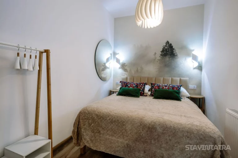 Sypialnia: 2 osobowe łóżko małżeńskie, wieszak na ubrania, lustro